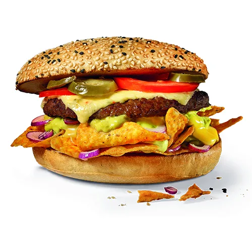 beefburger 100 gr, Brioche bun, tomaat, jalapeno’s, pepper jack, rode ui, tomaten chutney, nacho cheese saus, guacamole en nachos