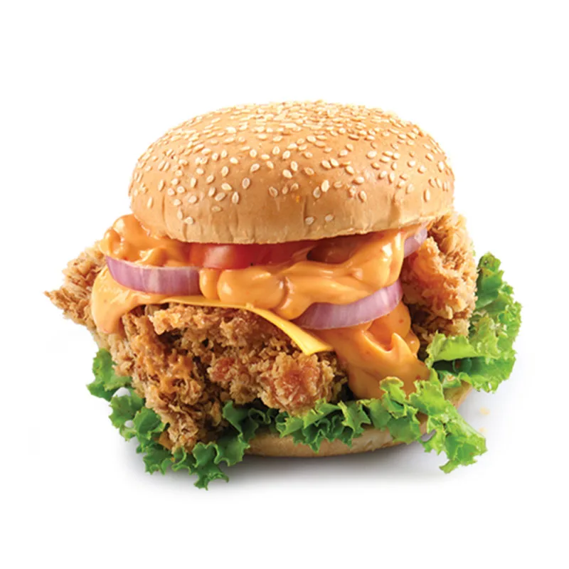 Chickenfilet burger, Brioche bun, gekarameliseerde ui, truffelmayonaise, tomaat, rode ui, sla en cheddar