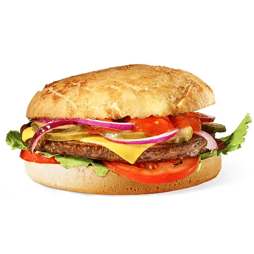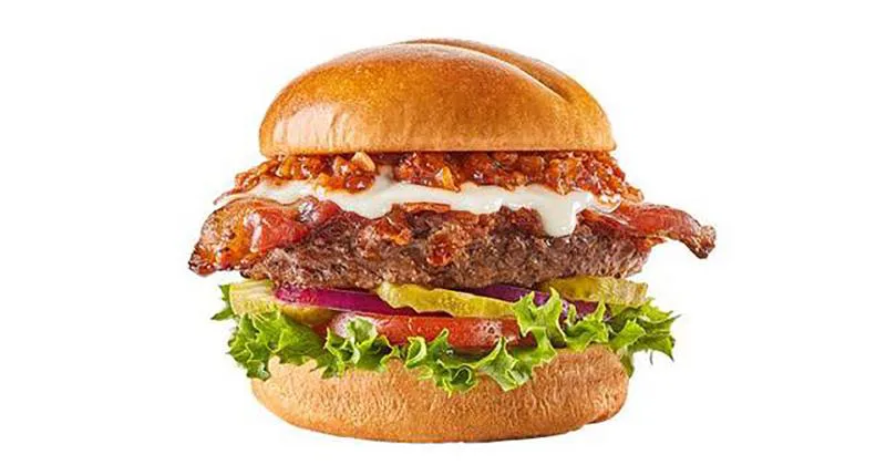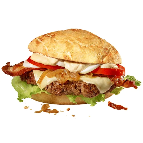 2 beefburgers van 100 gr, Brioche bun, cheddar, komkommer, tomaten chutney,truffelmayonaise, bacon, rode uienringen en sla.